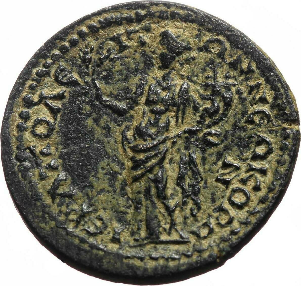 GIC 278 (Mên standing facing, head l., holding sceptre in l. hand and pinecone in r., Α in l. field, uncertain letter or character in r. field)