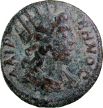 GIC 278 (Mên standing facing, head l., holding sceptre in l. hand and pinecone in r., Α in l. field, uncertain letter or character in r. field)