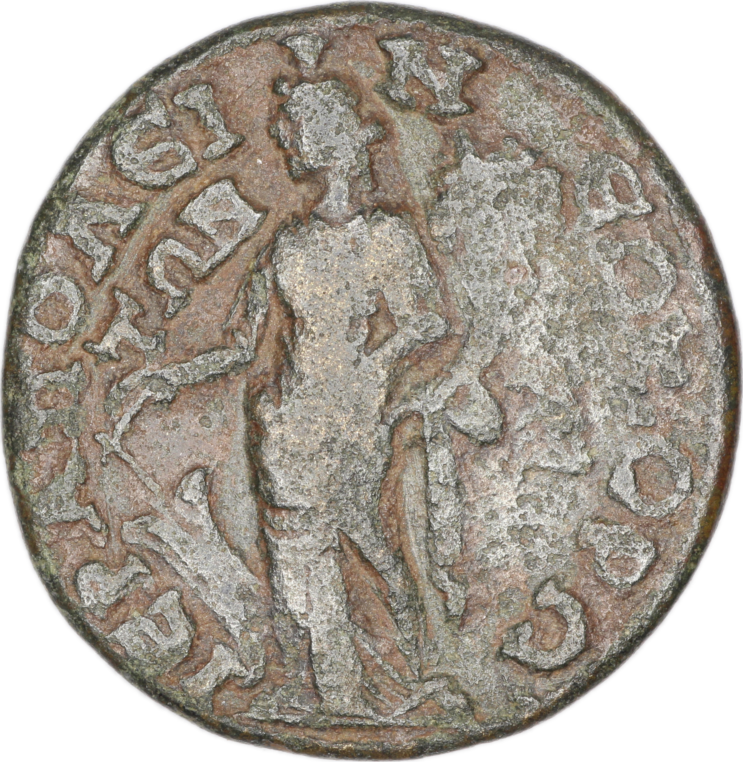 GIC 278 (Mên standing facing, head l., holding sceptre in l. hand and pinecone in r., Α in l. field, uncertain letter or character in r. field)