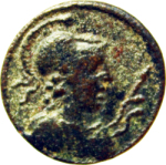 draped bust of Athena, wearing Corinthian helmet, right, with aegis, and holding spear
