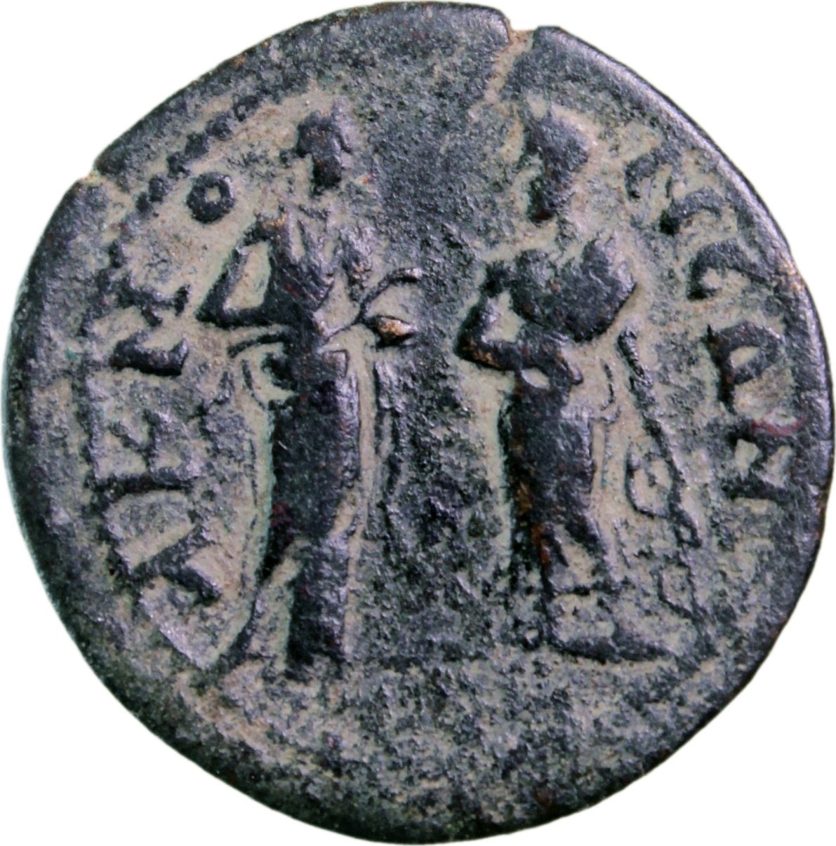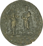 Asclepius standing facing, head left, holding serpent-staff, and Hygieia standing facing, head right, feeding serpent from patera