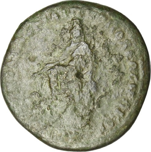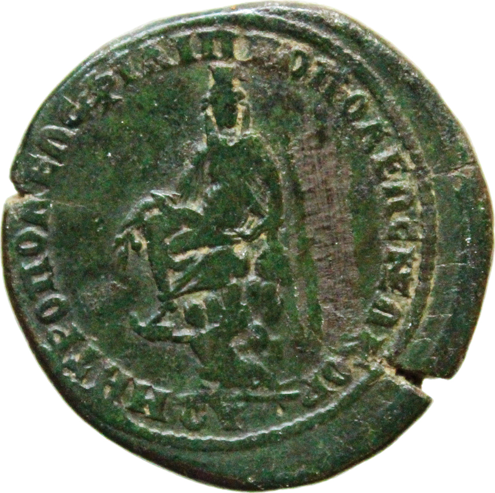 Tyche of the City seated on rock facing, holding corn ears; at her feet, river god swimming, left, holding prow on which the Tyche is resting her foot