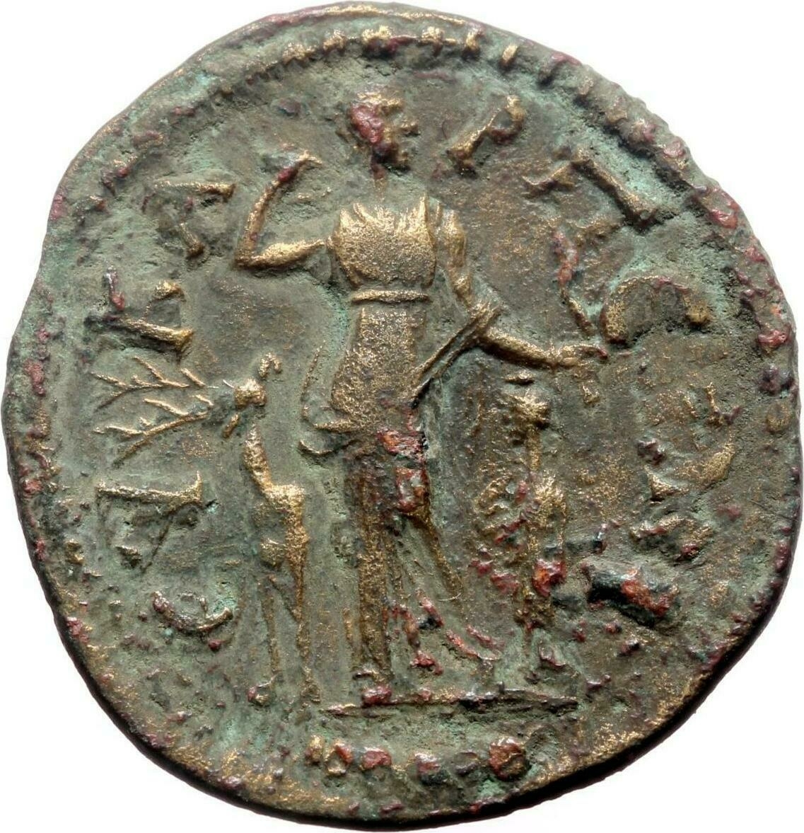 Artemis standing facing, head right, holding bow and placing hand on quiver; behind, stag, head right; before, priestess
