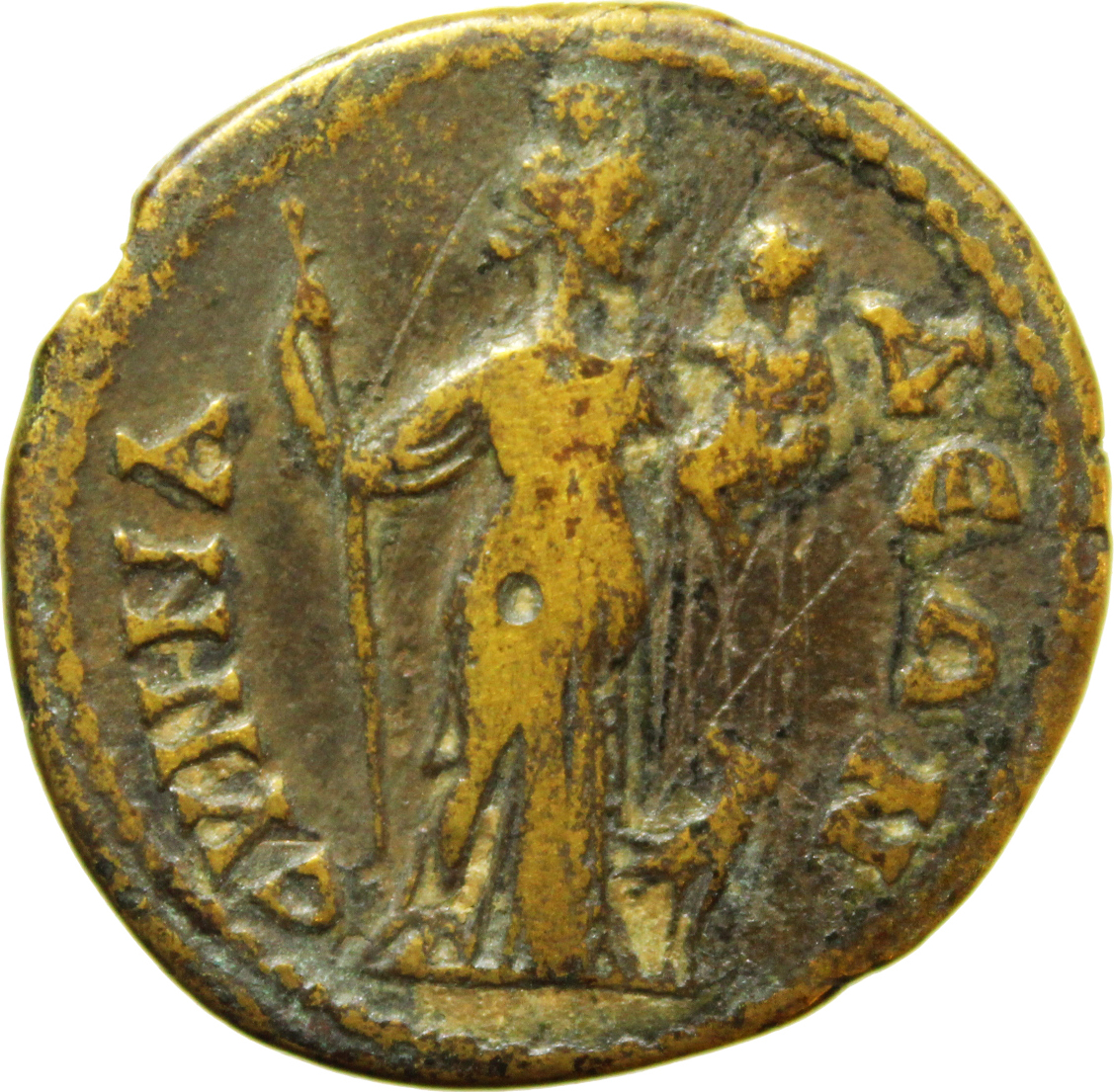 Amaltheia standing facing, head right, leaning on sceptre and holding infant Zeus; to right, at her feet, goat, right, looking back