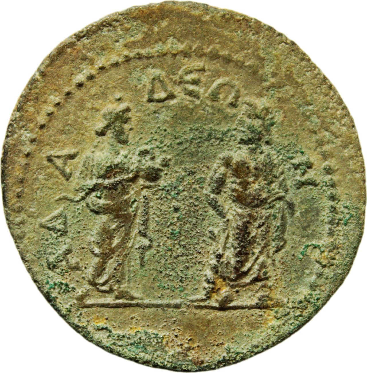 Asclepius standing facing, head left, holding serpent-staff, and Hygieia standing facing, head right, feeding serpent from patera