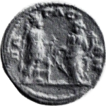 Artemis standing, right, with quiver on shoulder, holding bow and arrow, stag at her feet, and Tyche standing facing, head left, wearing kalathos, holding rudder and cornucopia