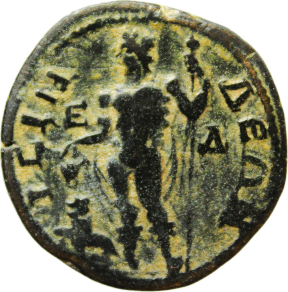 Dionysus standing facing, head left, holding long thyrsus and cantharus over panther, left