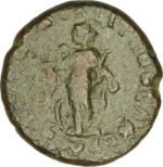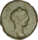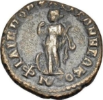 Nemesis, standing facing, head left, holding cubit rule and raising hand to pluck chiton; to left, wheel