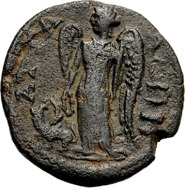 Nemesis standing facing, head left, holding bridle and rod; at her feet, griffin, left, looking back, placing paw on wheel