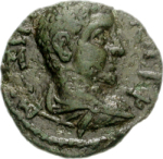bare-headed, draped and cuirassed bust of Maximus, right, seen from rear