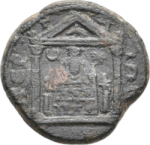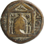 front view of a temple with two columns, within which cult statue of Pergaean Artemis, facing between crescent, to left, and star, to right; on either side of the statue, pilaster surmounted by eagle(?); in pediment, eagle