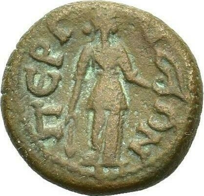 Artemis-Selene(?) standing in long chiton facing, head right, wearing crescent, holding bow and arrow
