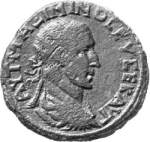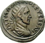 city gate with two towers; on the gallery, Poseidon standing facing, head right, about to throw trident and holding hippocamp |