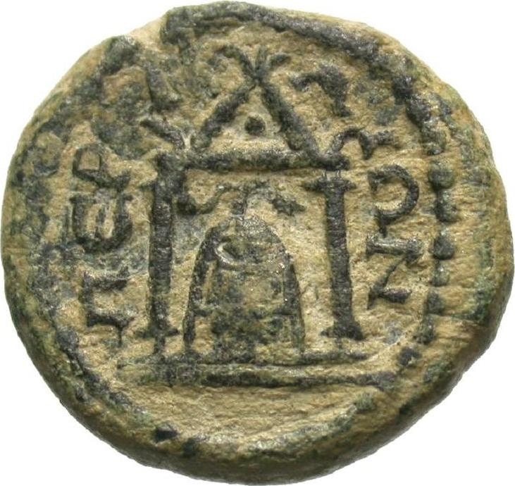 front view of a temple with two columns, within which cult statue of Pergaean Artemis, facing between star, to left, and crescent, to right; in pediment, pellet