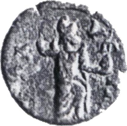 Mên standing facing, head right, wearing crescent on shoulders, holding pine cone and sceptre