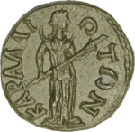 Selene standing facing, head right, wearing crescent on shoulders, holding long torch(?)