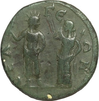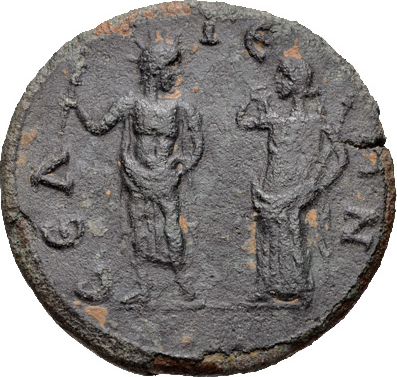 Helios nude standing facing, head right, holding torch, and Selene standing facing, head left, wearing crescent on shoulder and holding sceptre