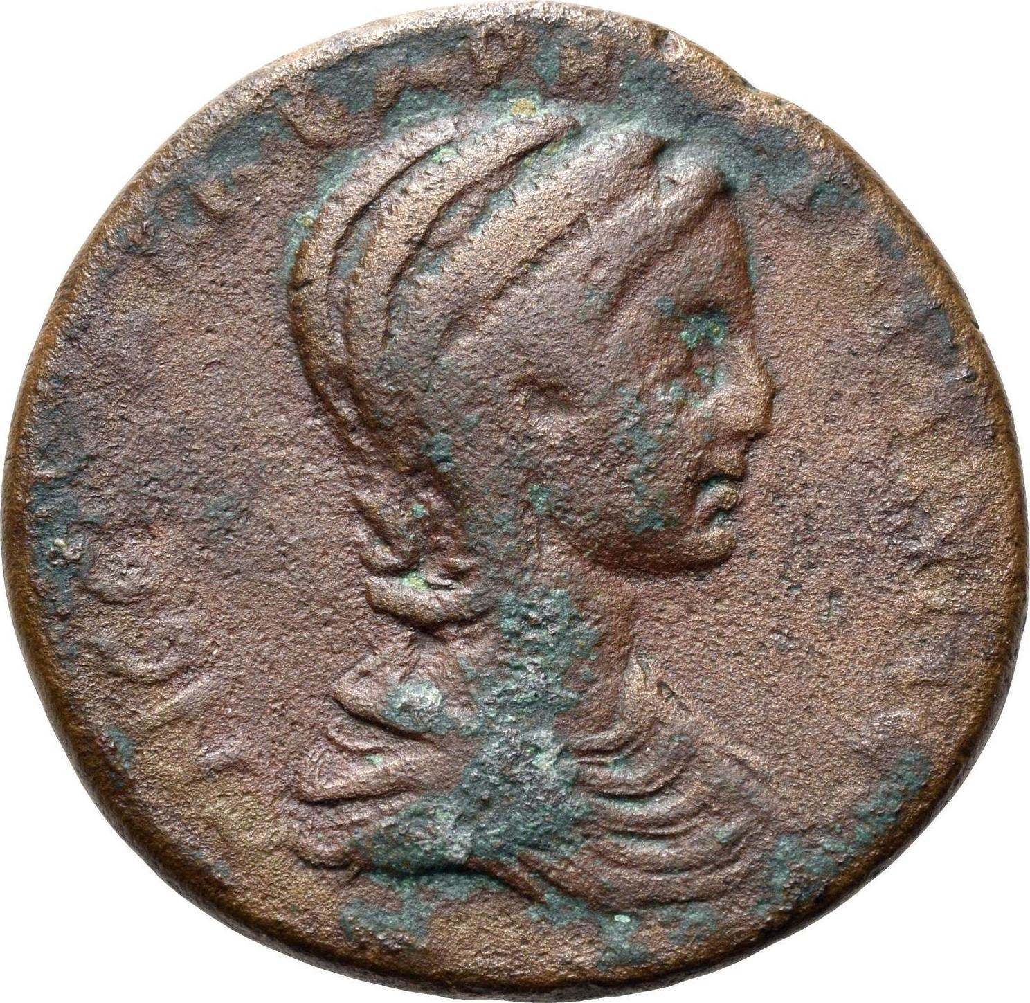 Athena standing facing, head left, holding spear and resting on military trophy to left; to right, on the ground, gladiatorial shield