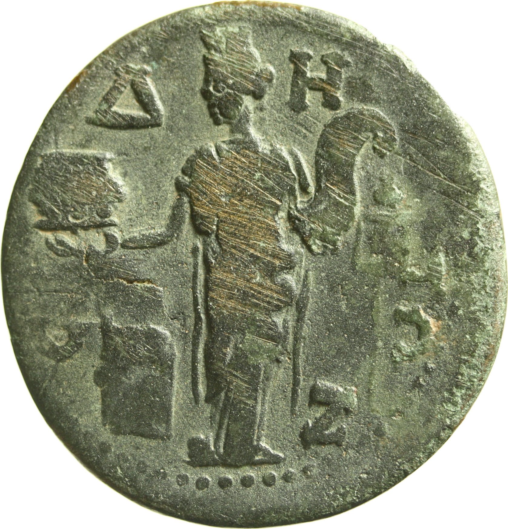 turreted Tyche standing facing, head left, holding prow and agonistic crown; at her feet, gladiatorial shield; to right, standard topped by pomegranate