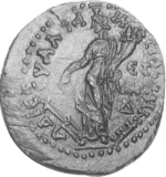 Tyche standing facing, head left, holding rudder and cornucopia |