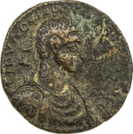 bare-headed, draped and cuirassed bust of Maximus, right, seen from front |