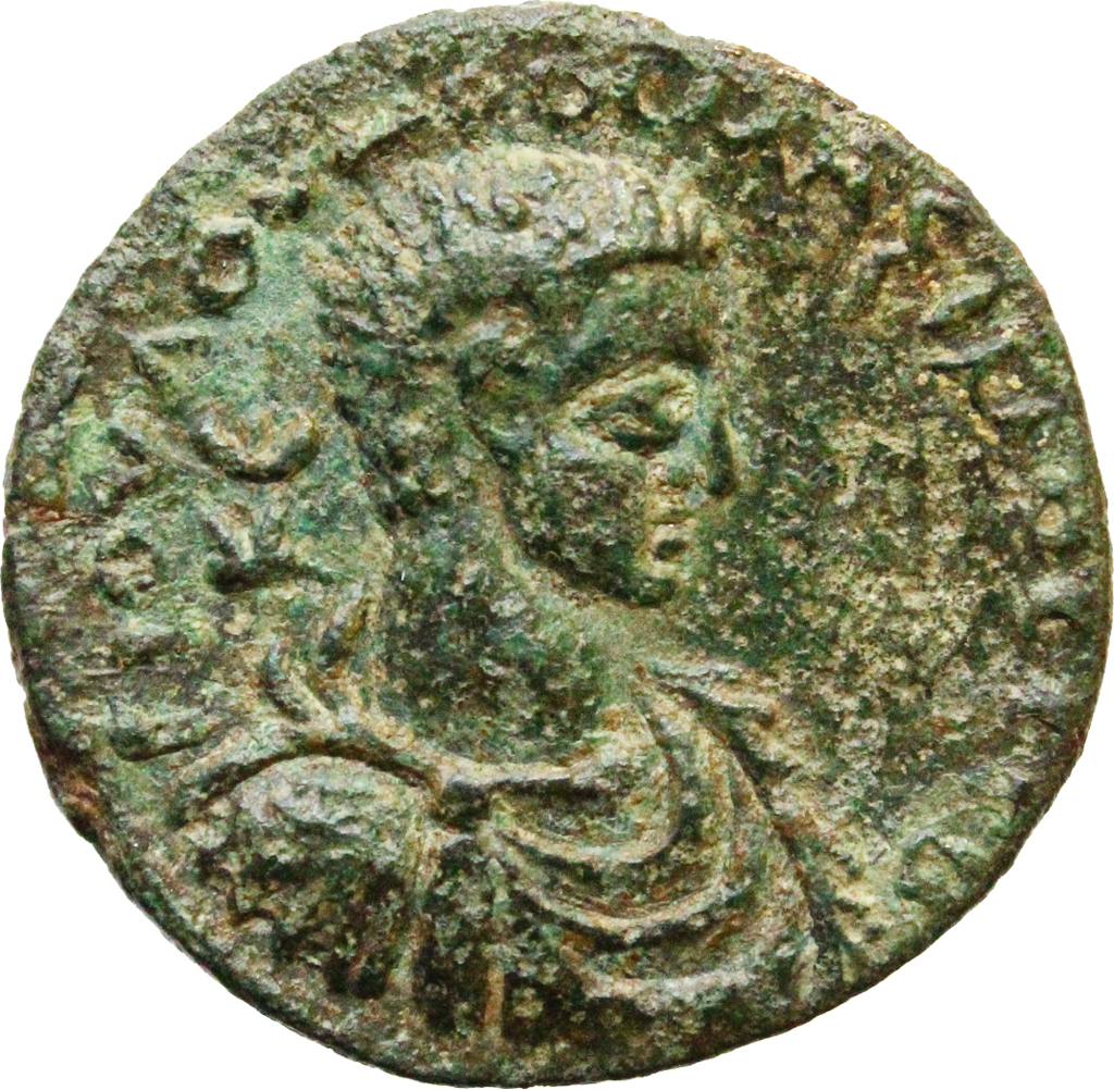 bare-headed, draped and cuirassed bust of Maximus, right, seen from front |
