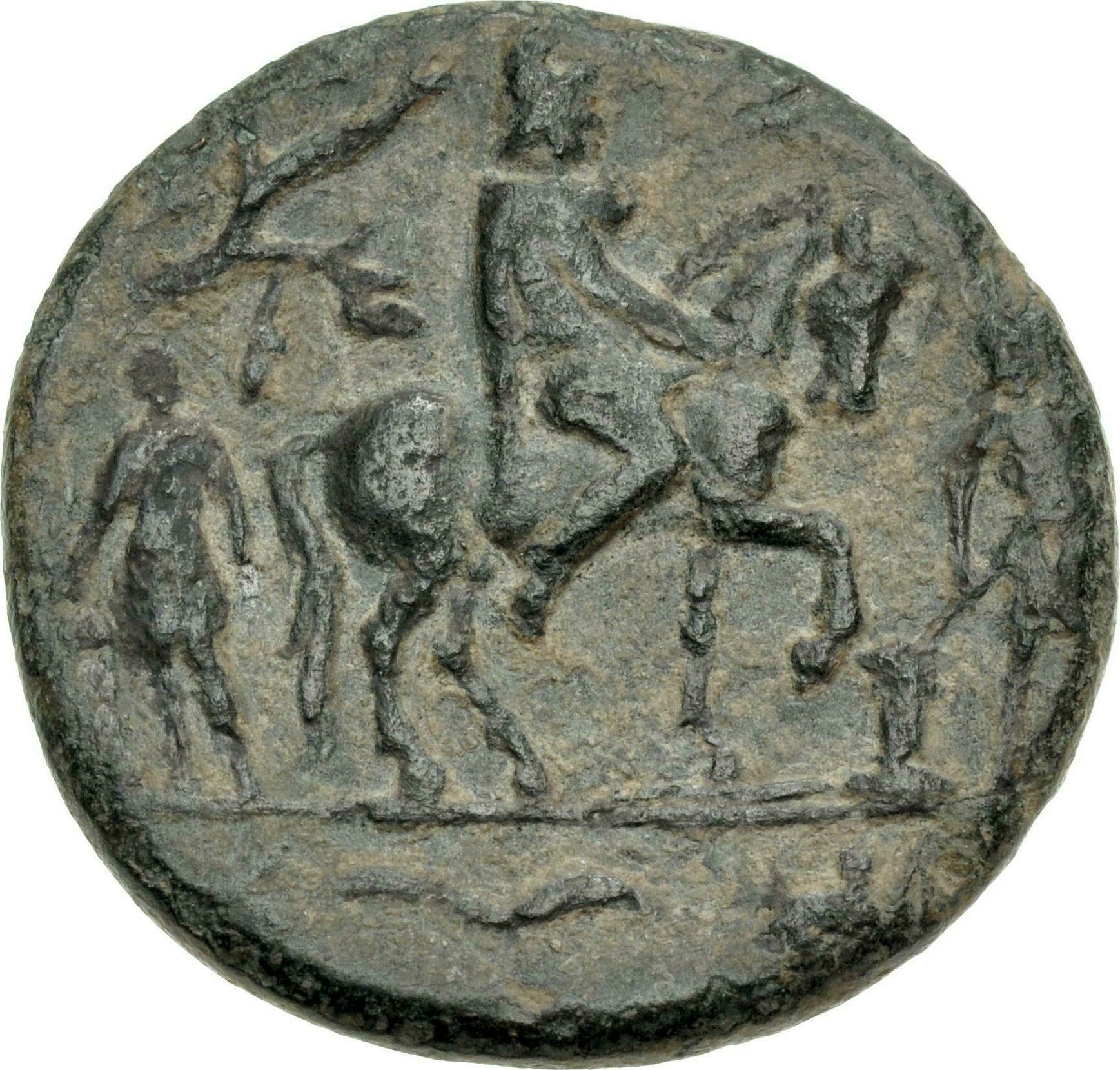 Mithras on horseback advancing, right, between two servants, the one to the right holding torch(?); to left, tree; to left of each servant, altar; in the exergue, serpent, right