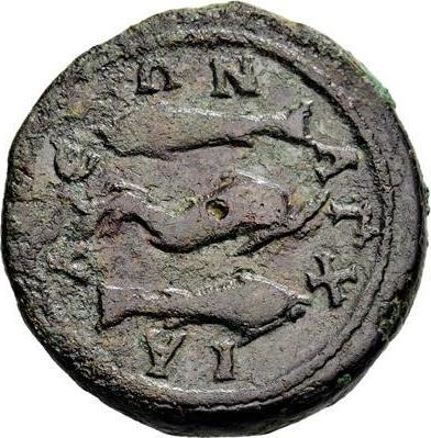 Dolphin coiled around trident, right, between two fishes, either the above one left and the below one right, or vice-versa