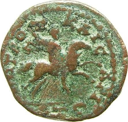 Emperor on horse galloping, right, wearing chlamys and brandishing spear |