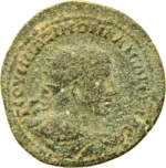 front view of temple with four columns, within which turreted Tyche of the City seated on rock, left, holding ears of corn(?); in pediment, wreath(?) |