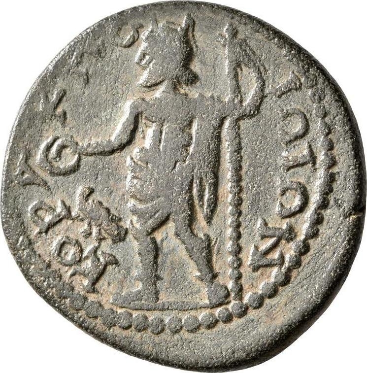 Zeus standing facing, head left, holding patera and long sceptre; at his feet, eagle, left, looking back