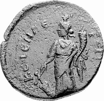 Tyche standing facing, head left, wearing kalathos, holding cornucopia and rudder