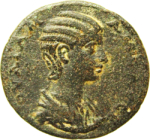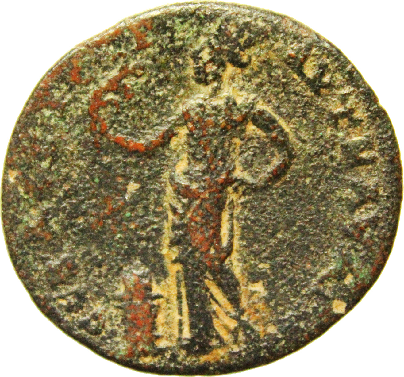 Tyche of the City(?) standing facing turreted, head left, holding aplustre(?) over lighted altar at her feet
