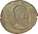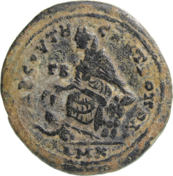 Tyche of the City seated on rock, left, holding ears of corn; at her feet, river god swimming, left |