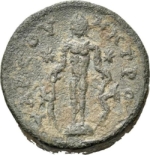 Apollo Lykeios standing facing, nude, on omphalos, holding wolf by forelegs in each hand; on either side, star