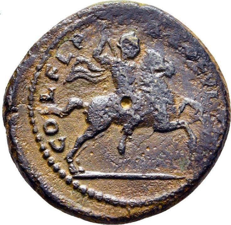 Reverse design Emperor on horse, galloping right, brandishing spear
