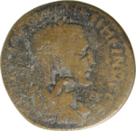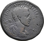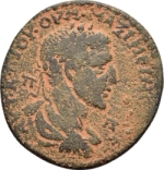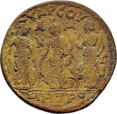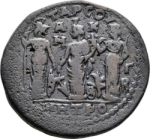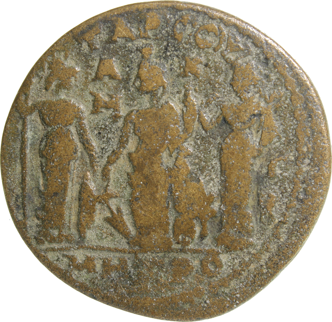 Athena standing, right, holding spear and resting on shield; Tyche standing facing, head left, wearing kalathos, holding rudder and cornucopia; and Nemesis standing, left, right hand raised to pluck chiton and holding rod; at her feet, griffin, left, placing paw on wheel |