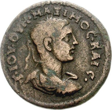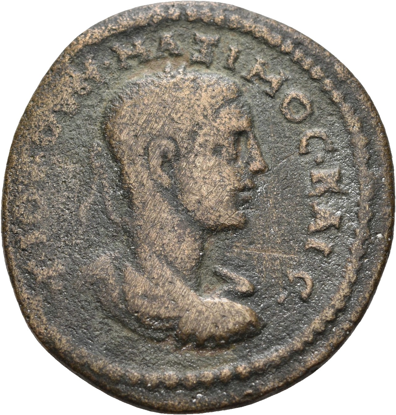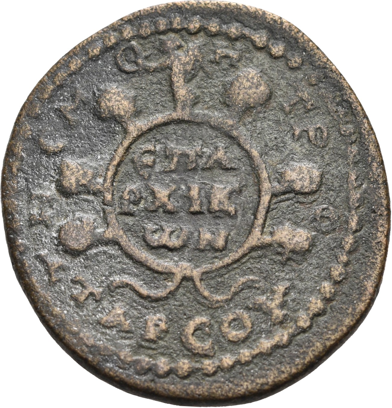 cilicarch crown with Nike standing, left, holding wreath an palm branch, among six imperial heads |