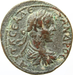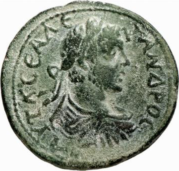 Artemis standing facing, head right, wearing short chiton, holding bow and drawing arrow from quiver on her shoulder; at her feet, stag, right, looking back; in front of her, Apollo standing facing, head left, crossing legs, leaning on small column and holding laurel branch |