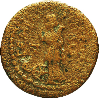 Nemesis standing facing, head left, holding cubit rule and right hand to mouth; at her feet, wheel |