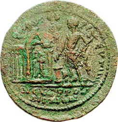 emperor standing, left, in front of temple of Asclepius, wearing chiton, holding eagle-tipped staff and patera over lighted altar; at his feet, reclining bull |