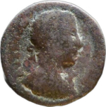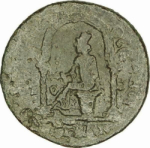 front view of shrine with two columns with arcuated lintel, within which Tyche seated on basis, left, holding ears of corn; at her feet, river god, left |
