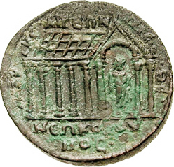temple with four columns seen in perspective, r, with arcuated lintel, within which Asclepius standing facing, head left, resting on serpent-staff |
