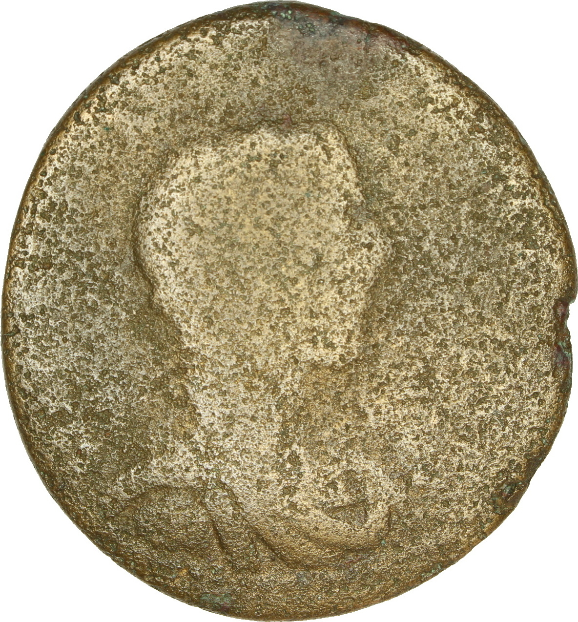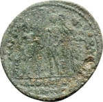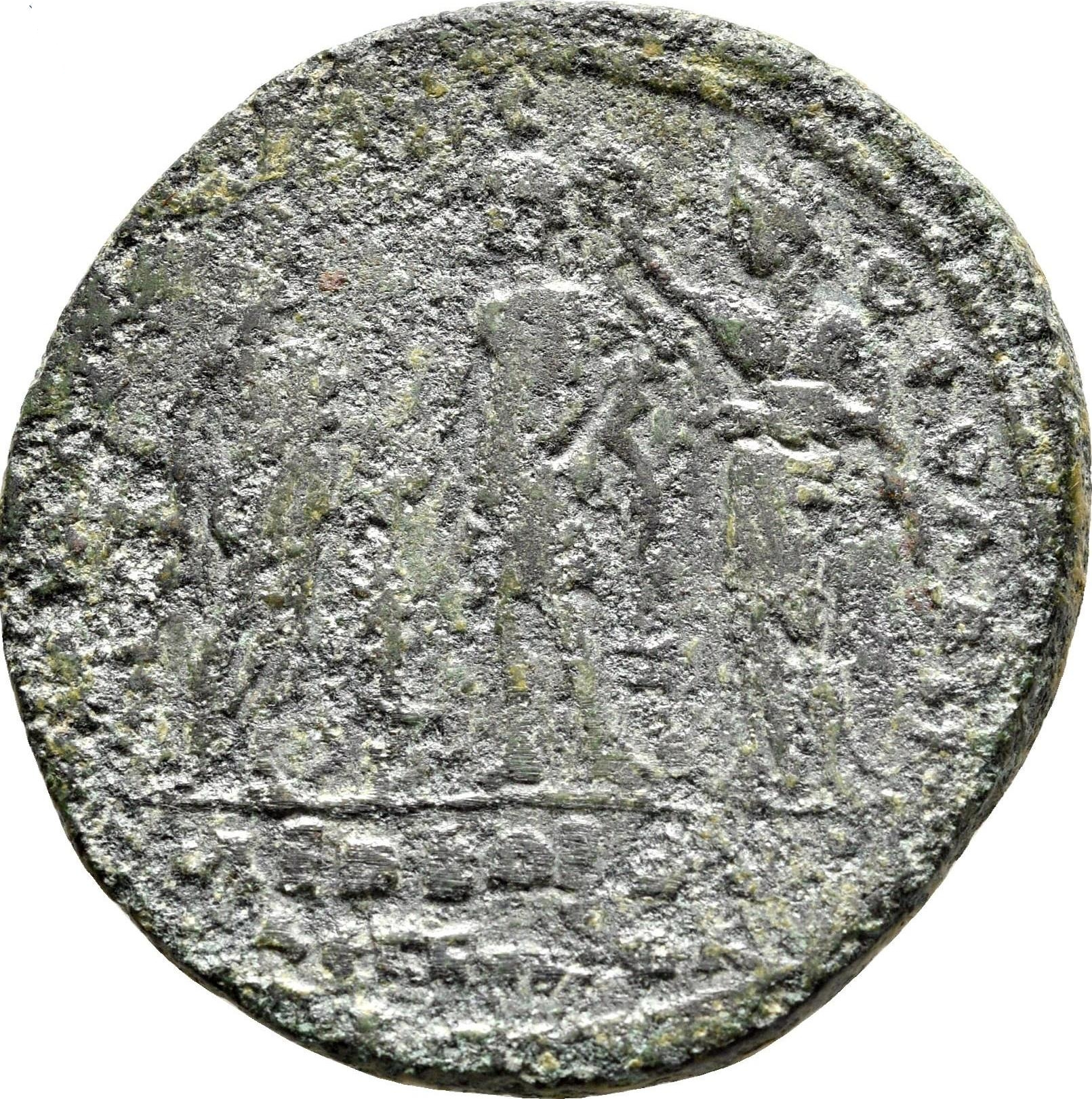 emperor standing facing, head left, holding serpent-staff and patera over lighted altar, in front of Asclepius standing facing, head right, resting on serpent-staff; to right, Tyche standing, left, crowning him with wreath from behind
