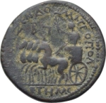 the Emperor driving a quadriga, left, holding reins and raising laurel branch |
