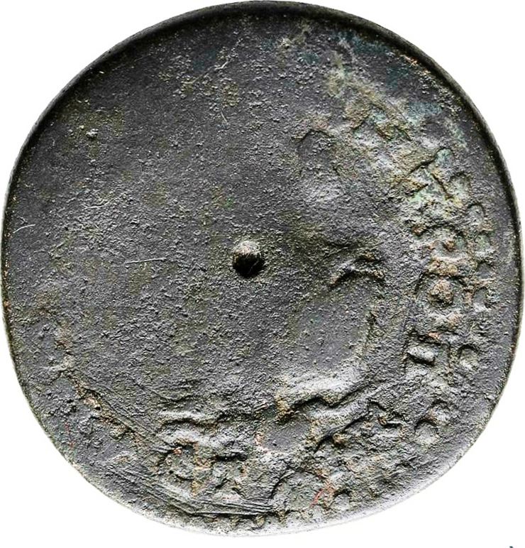 Tyche of the City seated on rock, right, holding branch(?); at her feet, river god Pyramos swimming, right |