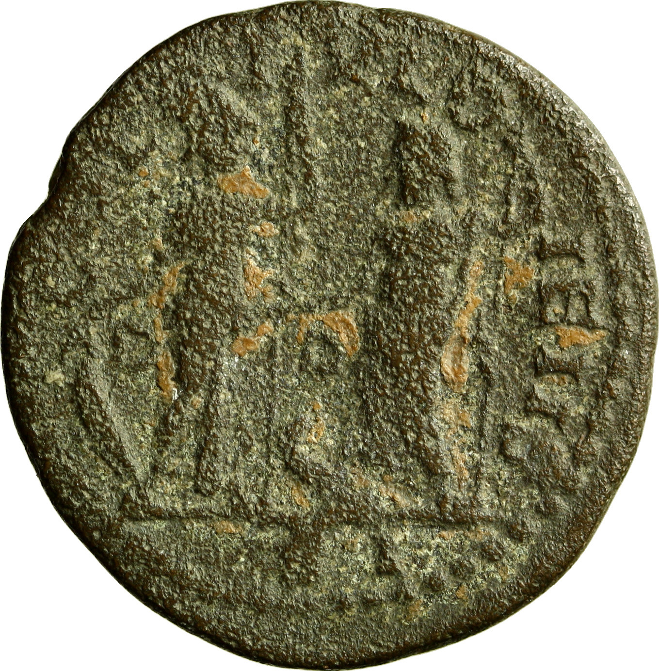 Zeus standing left, holding patera and long sceptre; to left, eagle.; in front of him, Athena standing right, holding spear and resting hand on shield