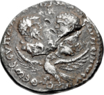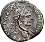 eagle facing, head right, spreading wings, holding wreath(?) in talons and carrying the draped busts of Divus Septimus Severus, right, and Divus Caracalla, left, facing each other |