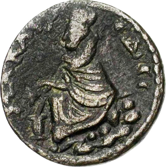 Tyche of the City seated on rock, left, holding corn ears; at her feet, lighted altar; below, river god swimming, right