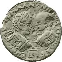 facing busts of Elagabalus, laureate, draped and cuirassed, right, and Severus Alexander, bare-headed, draped and cuirassed, left; below, small temple with pediment